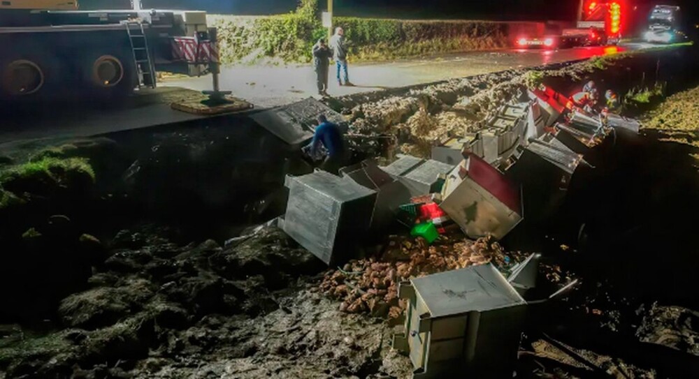 На севере Ирландии перевернулся грузовик, который перевозил около 15 тысяч живых крабов. В результате аварии контейнеры с крабами, предназначенными для ресторанов и магазинов в Португалии, получили повреждения и ракообразные оказались на свободе. 10 человек собирали крабов вручную с дороги и окрестного поля.