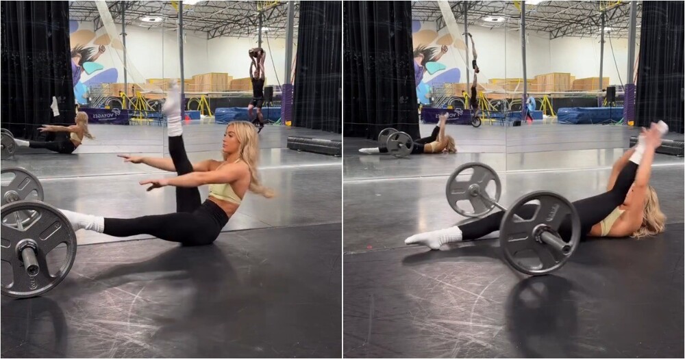 Цирковая артистка показала впечатляющую растяжку, демонстрируя гибкость и мастерство. Видео подчёркивает уровень подготовки и тренировки, необходимый для подобных трюков.